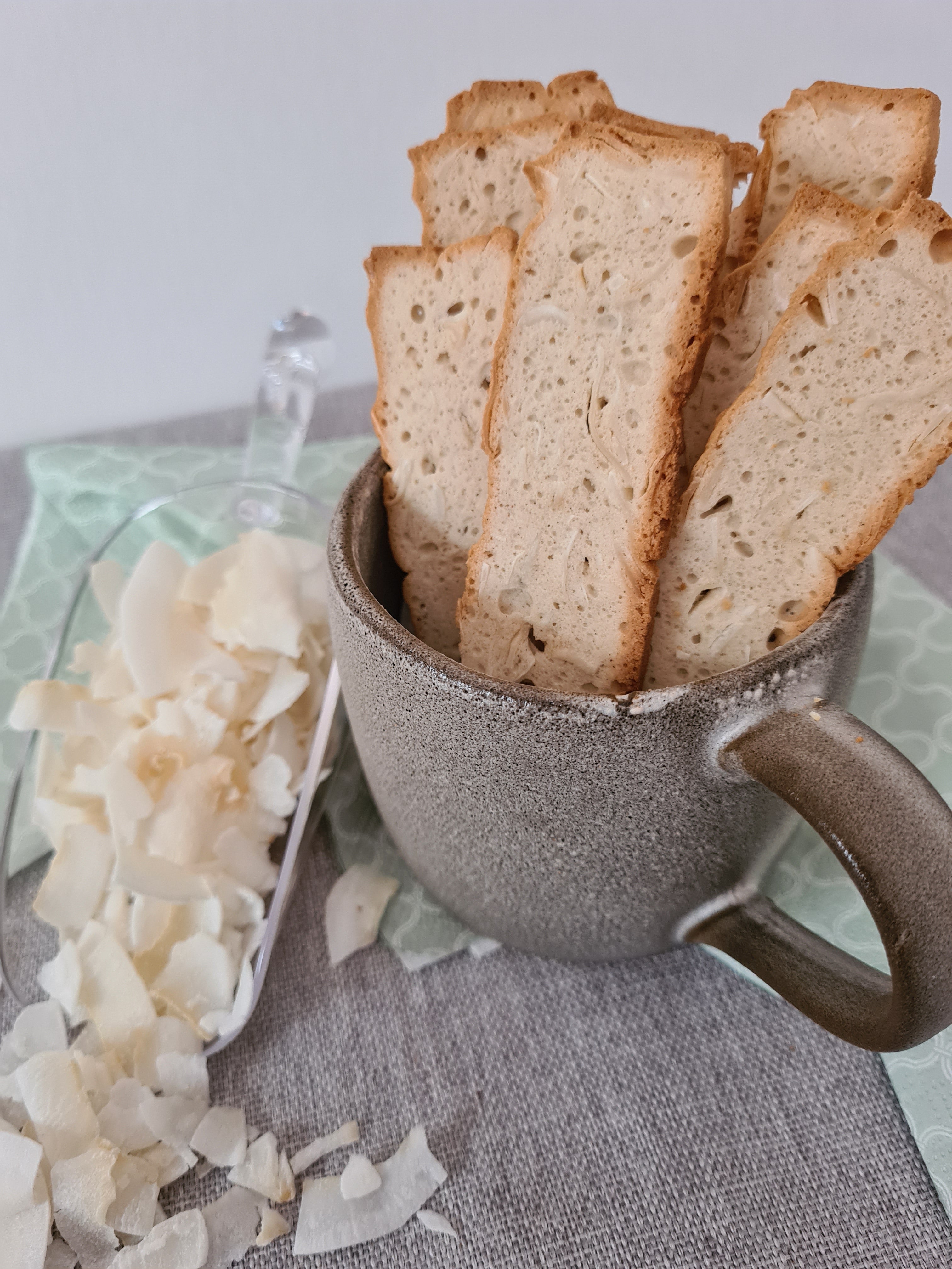 The soft sweet smell and taste of shaved coconut in a thinly sliced biscuit makes for a delicious crunchy treat.