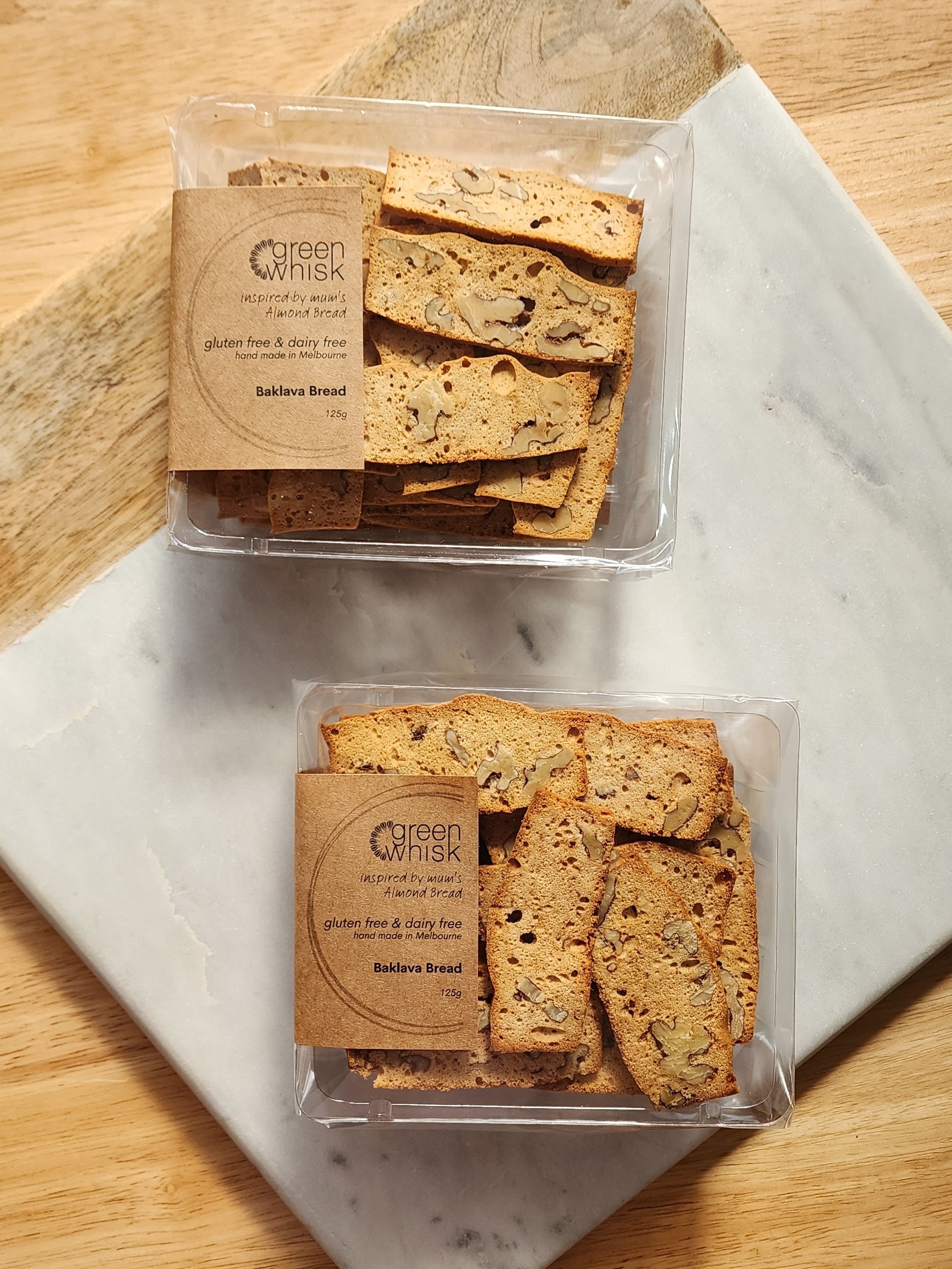 Introducing our Baklava flavoured bread. Our handcrafted product is made right here in Melbourne and inspired by our family's Baklava's recipe, we've created a gluten free bread with a spark of European flavours in every slice.